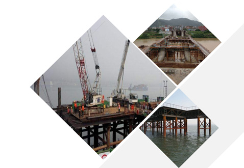 • 常見的施工平臺主要形式有:單棧橋平臺、雙棧橋平臺、利用鋼護筒導向和承載的平臺、利用圍堰或筑島承載的平臺、移動式平臺、水中整體吊裝平臺